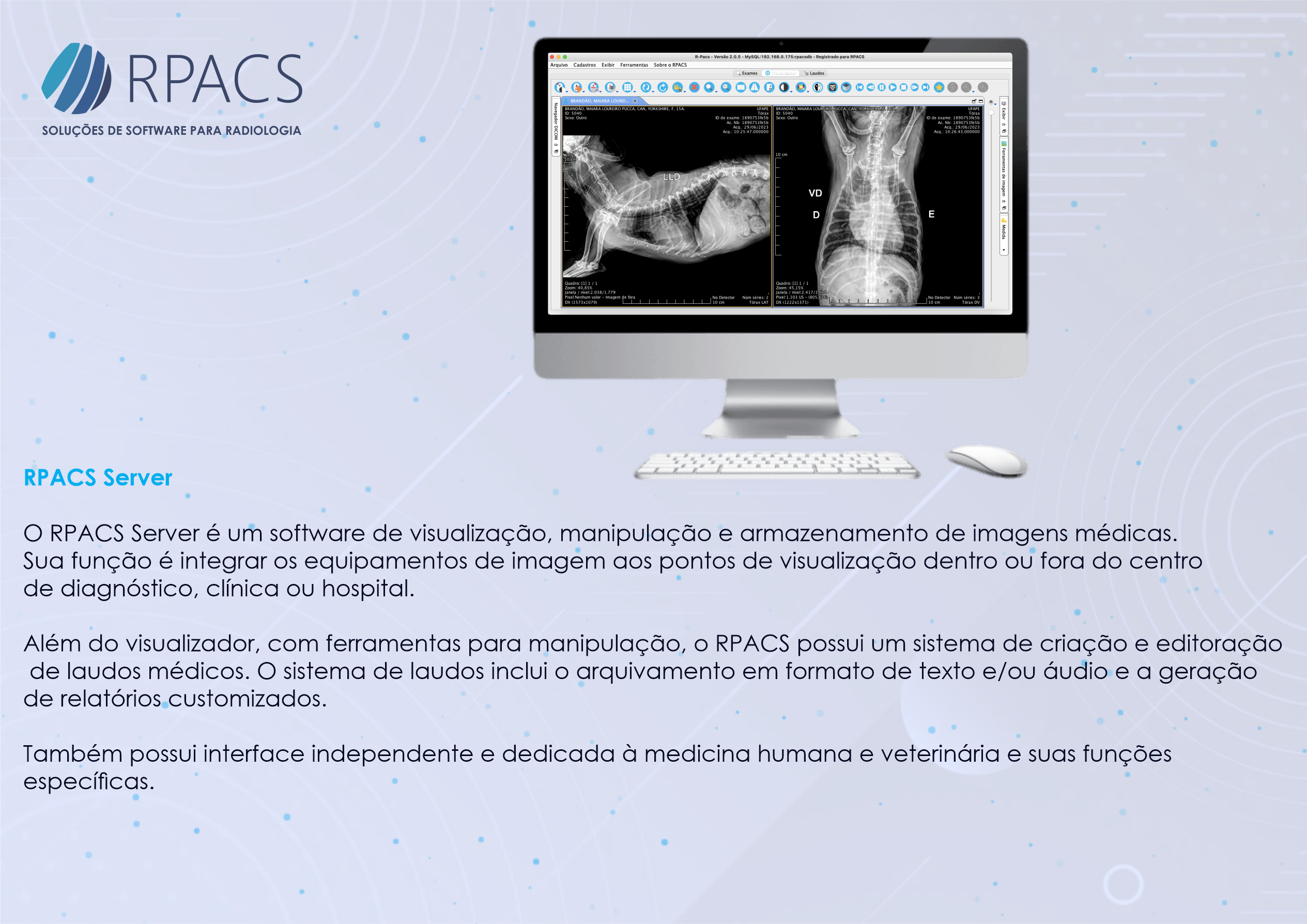 A missão de quem trabalha na área veterinária é cuidar dos animais e uma das mais importantes ferramentas aliadas da saúde é a tecnologia. Com o intuito de oferecer ferramentas que permitam um diagnóstico rápido, preciso e acessível, a Network Vet Care®️ desenvolveu as soluções de software RPACS® para Radiologia Digital. Ferramentas eficientes, econômicas e de simples utilização.